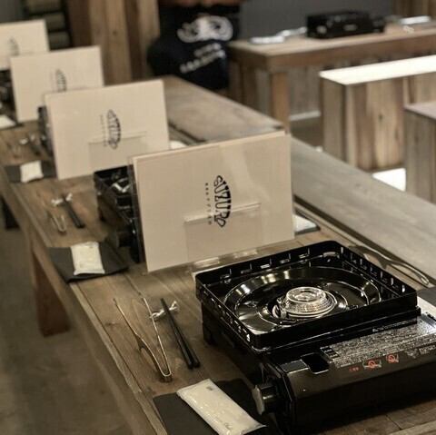 バーベキュー場をイメージした空間で楽しいひとときをお過ごしください♪木材やトタンを用いた山小屋風の空間でお食事をお楽しみいただけます。室内でありながら秘密基地のような賑やかで明るい雰囲気が魅力となっております♪