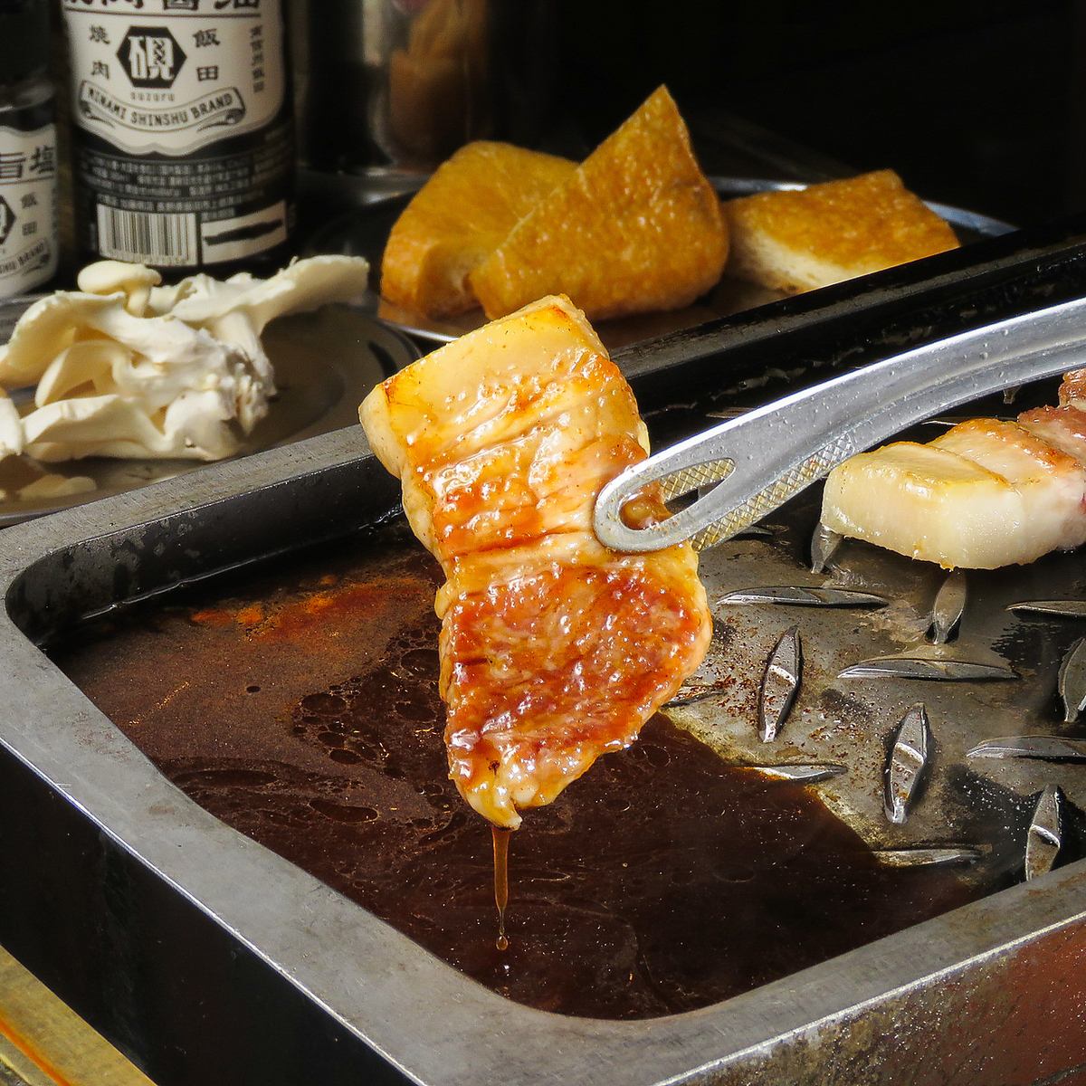 ニッチローの出身地である長野県飯田市で開発された「硯(すずり)型の鉄板」で焼肉を味わうことができます!人口1万人当たりの焼肉店舗数が多い、焼肉の街である南信州・飯田市の食文化や地域の魅力を全国に発信!焼肉仲間と共に生み出した”タレを育てる”という当店ならではのジャンルのB級グルメ焼肉をぜひご賞味ください